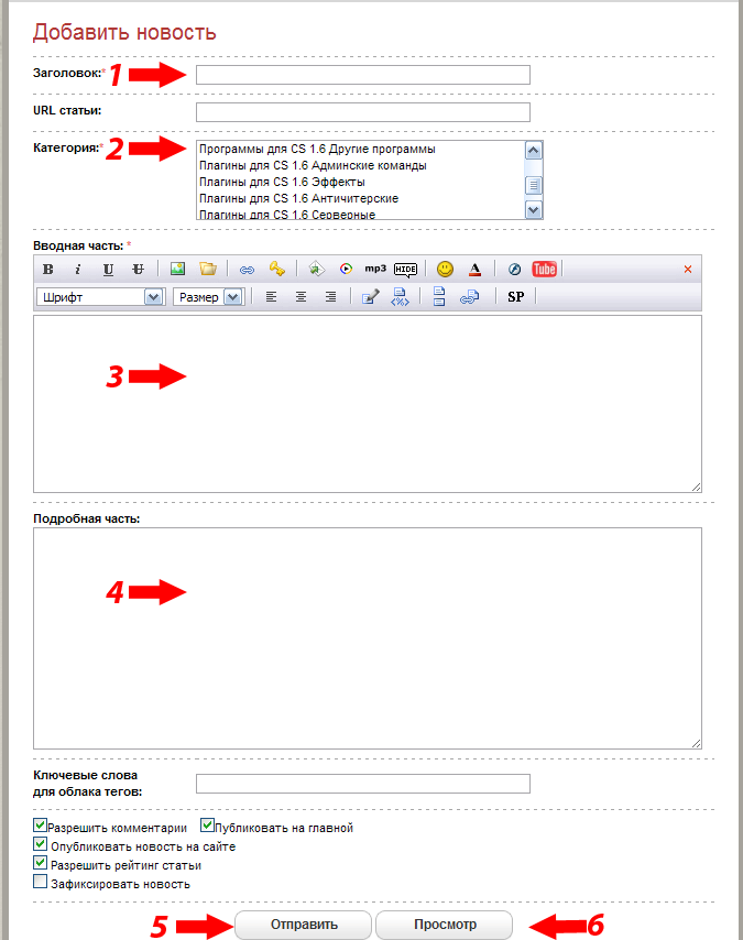 Любой желающий пользователь нашего портала может добавить на сайт новость, интересную статью, плагины, модели игроков оружия и так далее. Ниже указаны правила которые необходимо соблюдать при добавлении новости на наш сайт. Несоблюдение этих правил значит что ваша новость не пройдет модерацию и не будет опубликована на сайте. Так же многократное нарушение этих правил гразит вам лишением возможности добавлять новые новости и комментировать другие новость, будьте бдительны при размещении своего материала. 1. Для того, чтобы добавить новость, после регистрации нажмите "добавить новость" ![]() 2. Дальше мы видим окно добавления материала. 1. Заголовок статьи, должен в вкратце отображать сущность данного материала. 2. Выбираем категорию в которую мы будем добавлять 3. Краткое содержание новости (то, что будет отображаться на главной странице сайта). ============================================================ Картинки - Главную картинку(постер) льём на сайт (никаких внешних ссылок на картинки, все материалы только на наш сайт) - При заливке картинки обязательные пункты опций (Автоматически уменьшать картинки, Наложить водяной знак на картинку) - Расположение картинки строго по центру; - Размещение картинки должно выглядеть следующим образом если ее размеры больше чем 450х360 [thumb]КАРТИНКИ[/thumb] - картинка должна быть красивая и обработана по возможности в графическом редакторе и отображать сущность данной статьи. - никаких водяных знаков других ресурсов. ============================================================ - короткое описание новости, 2-10 предложений которые рассказывают о том что увидит пользователь в продолжение. - желательно в начале описания поставить краткое название и выделить жирным. 4. Полная новость. - копируем краткую вместе с картинкой; - более подробное описание новости; - добавляем скриншоты Все файлы можно добавить через редактор новости и значок который вы видите ниже на рисунке. ![]() ============================================================= Ссылки, файлы. - Файлы загружать на наш сайт "Cs-Arena.Ru" и никуда больше . Думаю все понятно, на всякий случай напоминаю: - никакой рекламы, довесков в архивах и уж тем более вирусов. Ссылки на сторонние ресурсы (сайты) являются рекламой. =============================================================